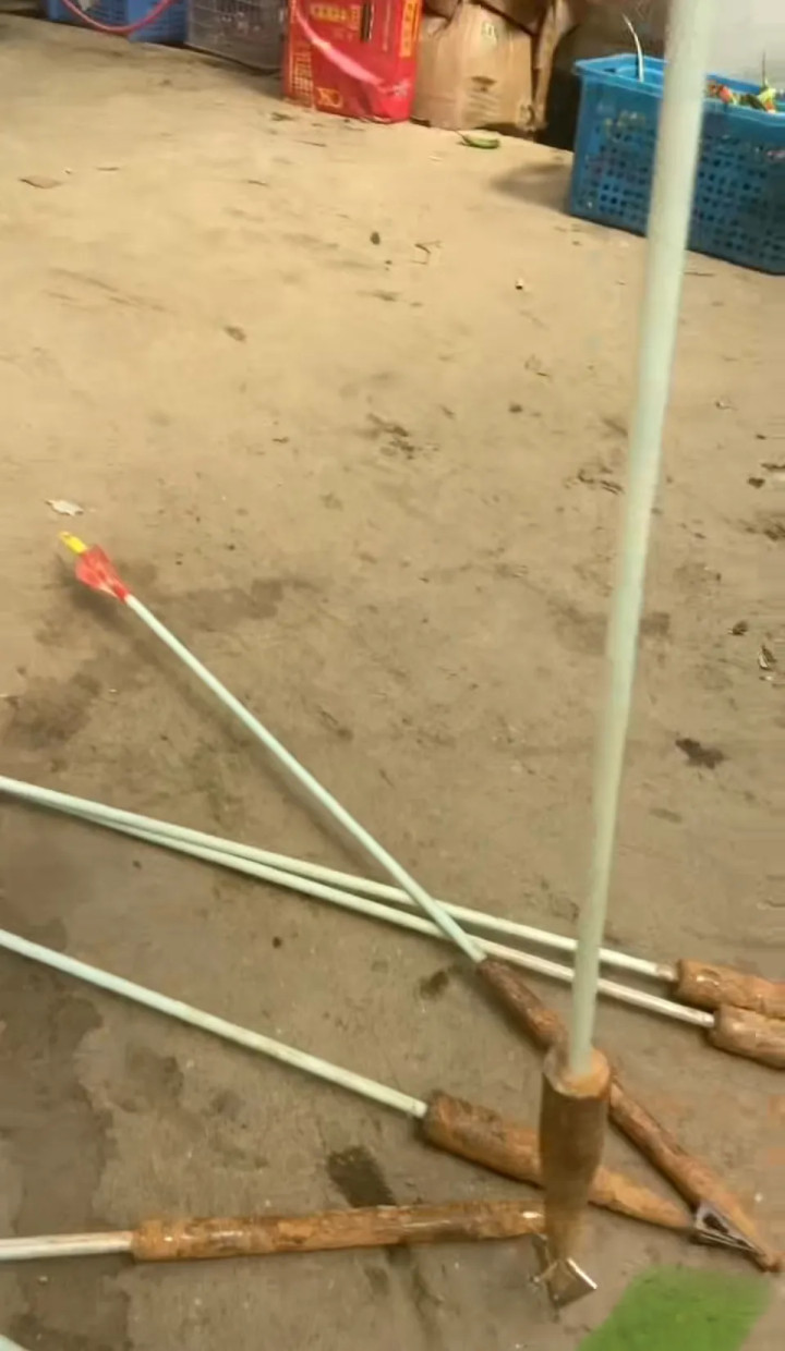 猪场主人向先生称,猪平时是在山上的林子里放养,除了下山吃食,一般不回猪舍。10月7日,向先生外出一个多月回来,突然发现猪一下少了很多,察觉不对劲的向先生上山去寻找,却在养猪场的外围发现了十几支箭头,“开始我以为是别人打了个地标的,它是很竖起来,插到很深的土里面。一支最起码有六七十厘米长,三菱箭头,很锋利,上面带的铁。”