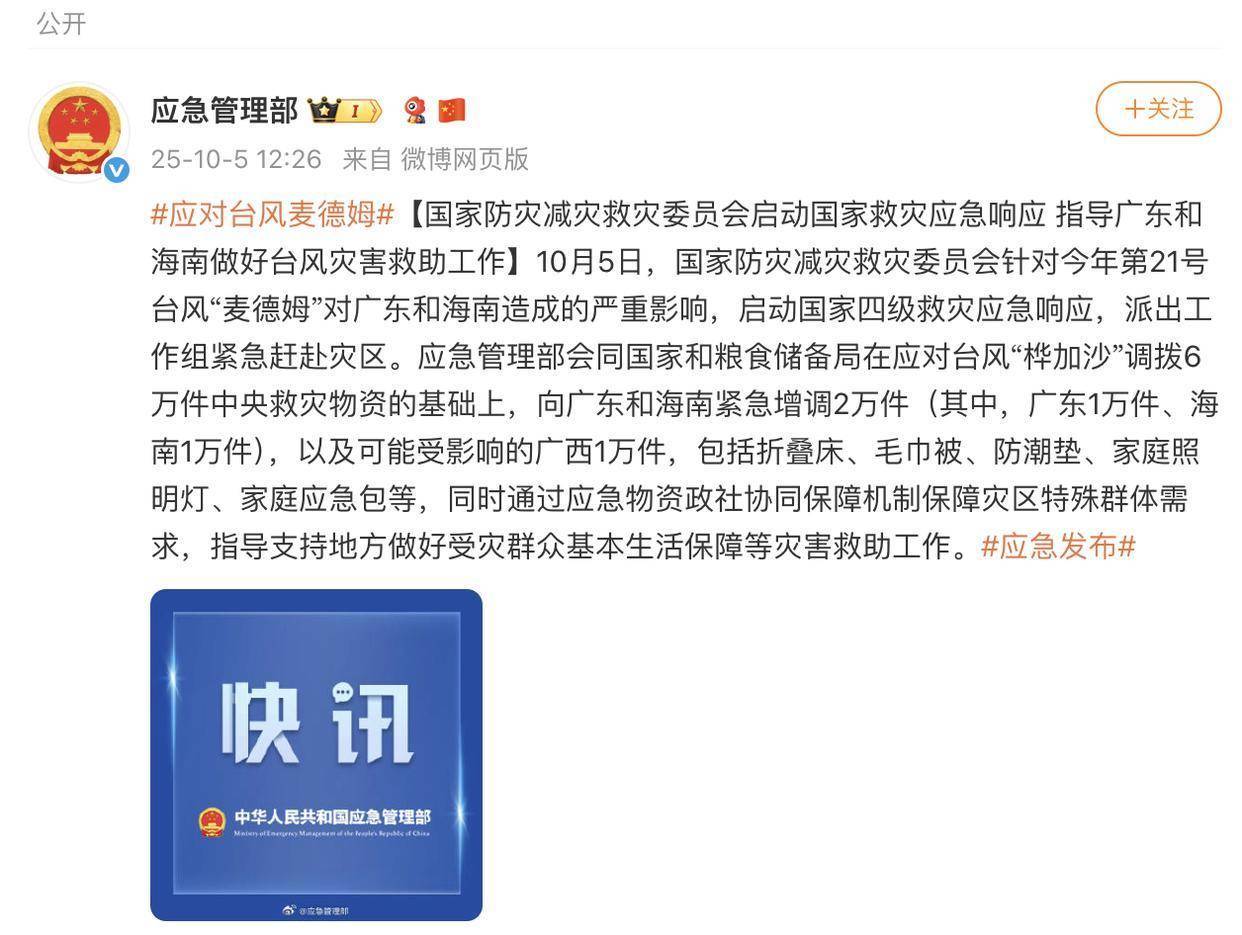 10月5日3G配资,国家防灾减灾救灾委员会针对今年第21号台风“麦德姆”对广东和海南造成的严重影响,启动国家四级救灾应急响应,派出工作组紧急赶赴灾区。
