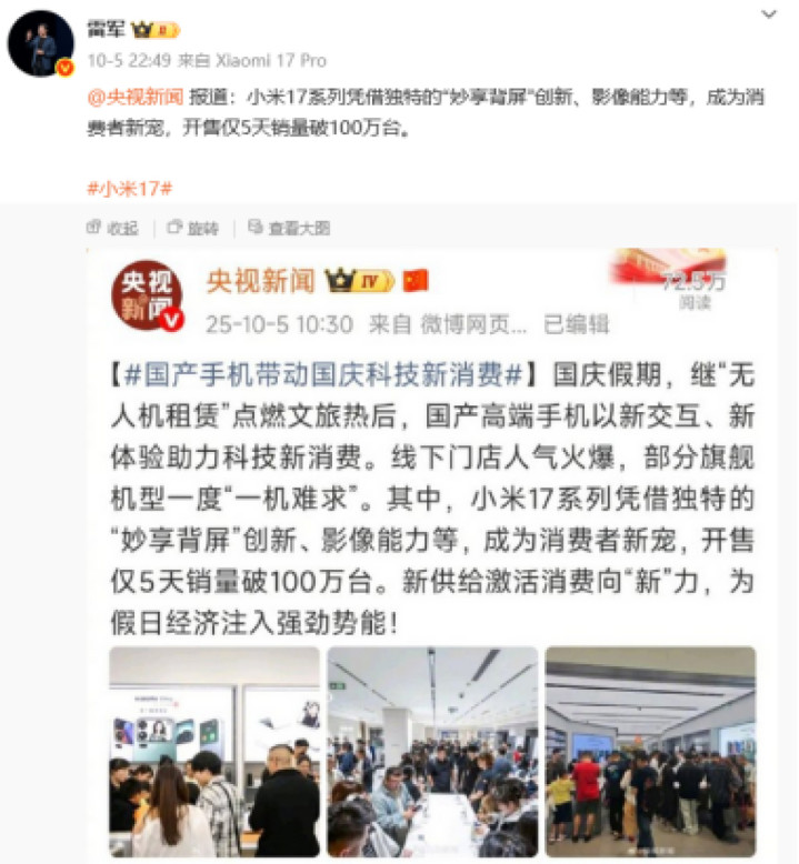 关于手机背屏的设计是否鸡肋,小米17系列的销量已给出答案。10月5日,雷军转发了央视新闻发布的微博。并提到小米17系列开售仅5天销量突破100万台。雷军随后进一步透露,带“妙享背屏”的小米17 Pro Max不仅单独刷新纪录,更占据了该系列超过一半的销量。