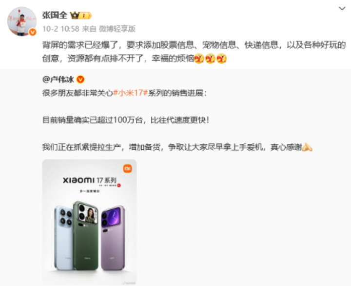 而对于小米17 Pro系列的“妙享背屏”的个性化需求,也忙坏了小米的系统软件设计部。近日,小米手机系统软件部总监张国全透露,用户对背屏功能的需求已“全面爆发”,各类定制化诉求如显示股票信息、宠物动态、快递进度等接踵而至。他直言:“资源都有点排不开了,幸福的烦恼。”