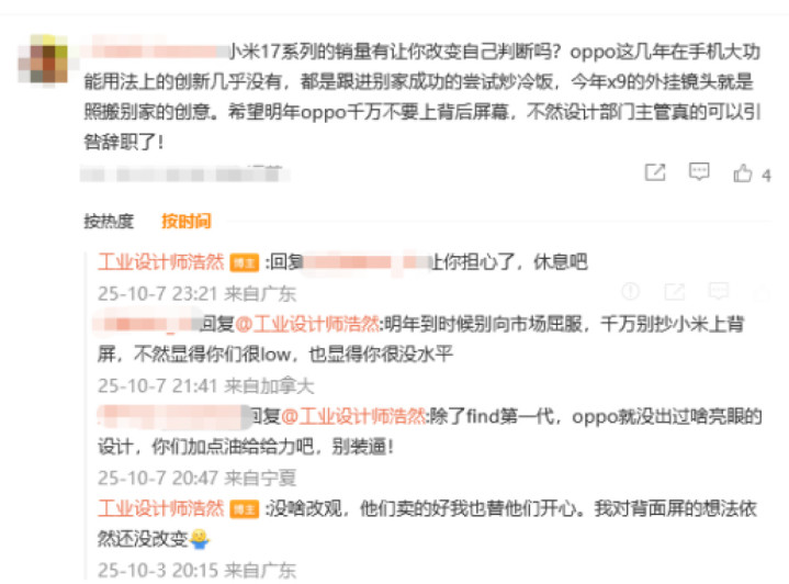 虽然刘浩然没有表明自己所说的事哪个品牌的哪款产品,近期上线售卖的带有背屏的直板手机,目前仅有小米刚推出的小米 17 Pro 系列。刘浩然针对手机背屏设计的微博也迅速吸引众多网友参与讨论,与刘浩然展开激烈讨论。