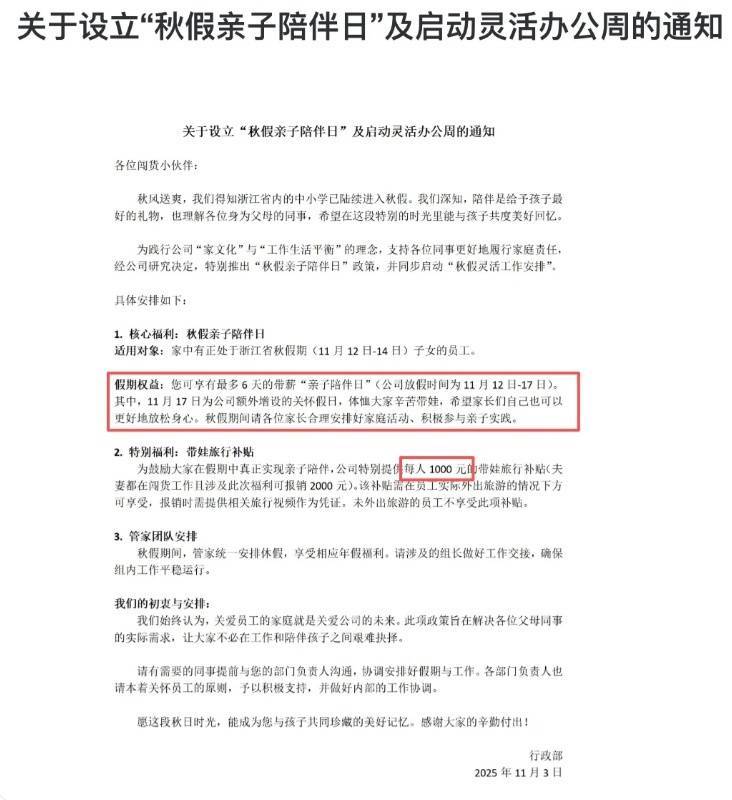 据通知原文,家中有正处在浙江省秋假(11月12日-14日)子女的员工,可以享有最多六天的带薪“秋假亲子陪伴日”,公司放假时间为11月12日至11月17日。其中,11月17日为公司额外增设的关怀假日。